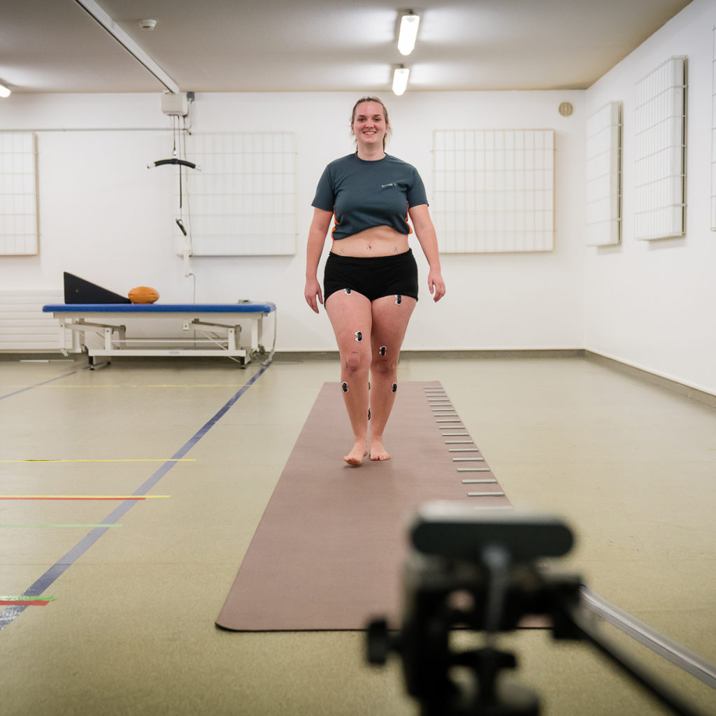 2 enregistrements vidéos synchrone sont réalisés, de face et de profil, sur un couloir de marche de 10m. En parallèle sont enregistrés les paramètres spatio-temporels de marche avec un tapis connecté Gaitrite et un électromyogramme (EMG) de surface avec le système Cometa 16 électrodes.