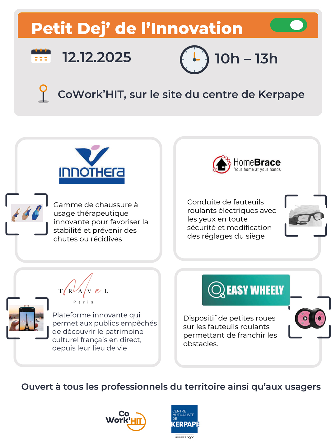 Le 12 décembre 2025, de 10h à 13h, rendez-vous au Centre de Kerpape pour un nouveau Petit Dej’ de l’Innovation consacré aux aides techniques et solutions innovantes pour faciliter le quotidien des personnes en situation de handicap.